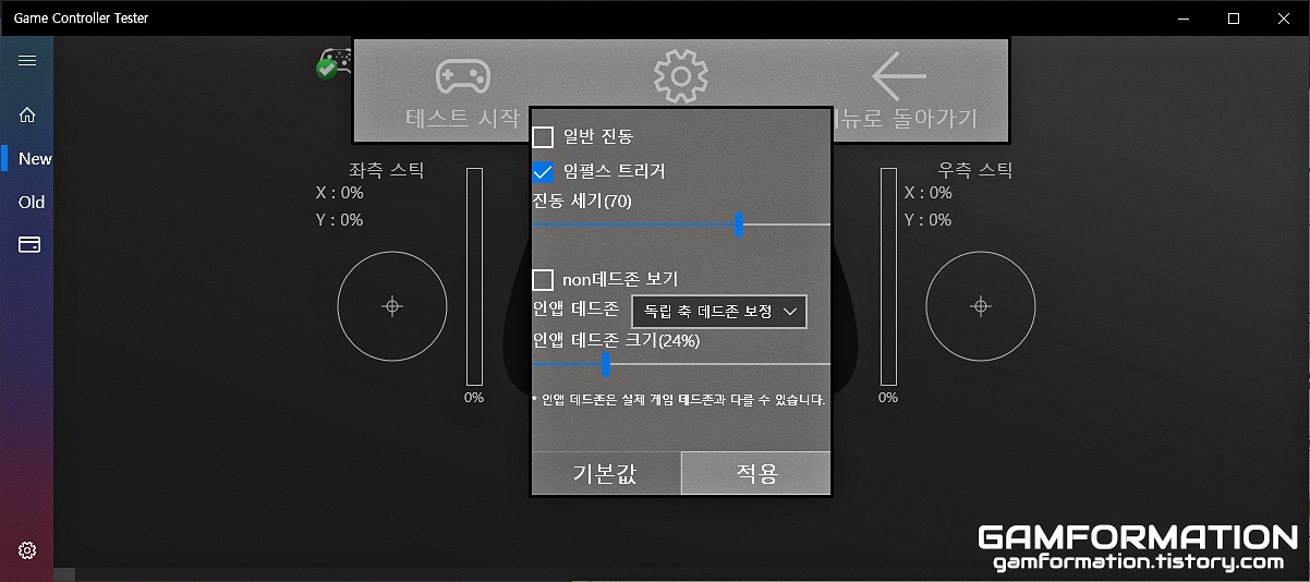 옵션을 보면 알겠지만 Xbox 컨트롤러에는 일반 진동은 물론이고 임펄스 트리거라는 기능이 있어 이것까지 테스트를 해줘야 하기 때문이다. 일단은 일반 진동에만 체크하고 적용을 선택하자.