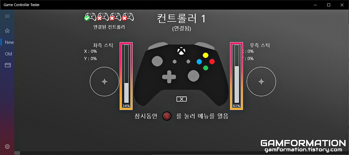 컨트롤러를 무선이건 유선이건 아무 방식으로나 하나 연결해주고 나면 이렇게 전부 X 표시만 되어있던 것에 하나의 녹색 체크 표시가 생기게 된다. 즉, 컨트롤러를 연결한 것으로 이 프로그램을 이용해 해당 컨트롤러가 제대로 작동하는지 확인할 수 있게 되었다는 것.