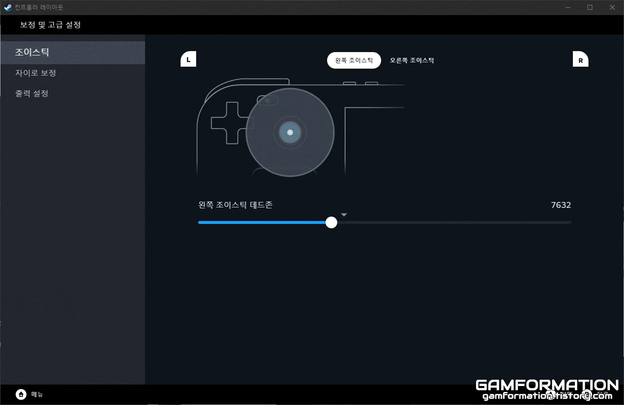 양 쪽의 조이스틱을 가만히 뒀을 때 인식하지 않도록 맞춰볼 수도 있다. 스팀에서는 이미 여러 컨트롤러를 지원한 지 수년이 흘렀기에 꽤나 디테일한 옵션들을 자체적으로 조절할 수 있어 이런 기능들은 필요하다면 적극적으로 사용해 주는 것이 좋다.