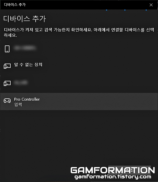 또한, 이 화면에서 혹시라도 예전에 프로콘을 연결한 적이 있어 Pro Controller가 목록에 있을 수 있는데, 진행에 문제가 있을 수 있으니 혹시라도 있다면 장치 제거 버튼을 통해 없애놓도록 하자.