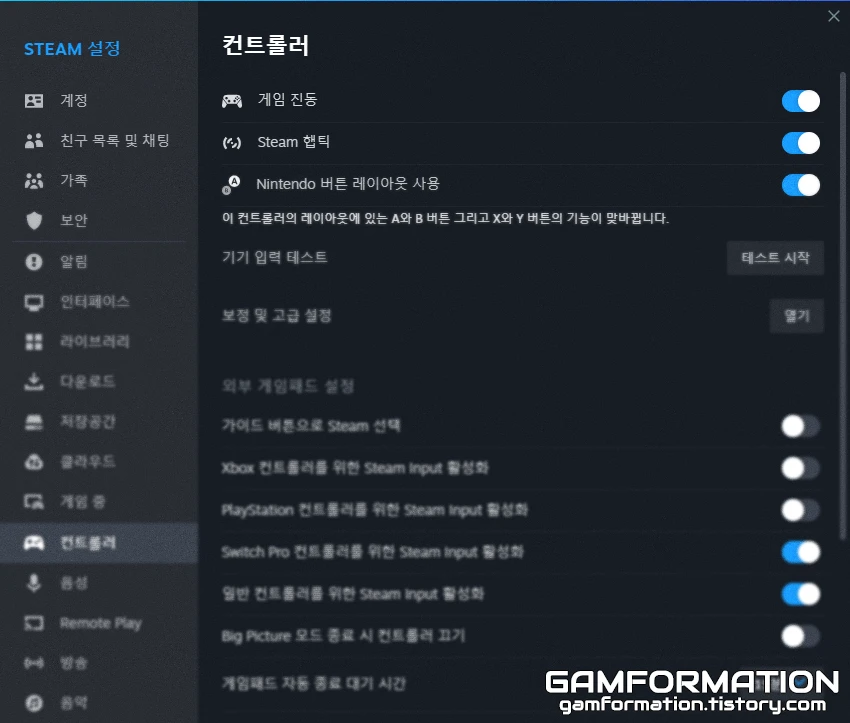 여기서 컨트롤러 탭을 눌러보면 Xbox, PlayStation, Nintendo의 컨트롤러를 포함해 여러 컨트롤러를 지원하는 것을 확인할 수 있는데, 프로콘만을 스팀용으로 사용하고자 한다면 아래의 두 옵션은 활성화시키는 것이 좋다.