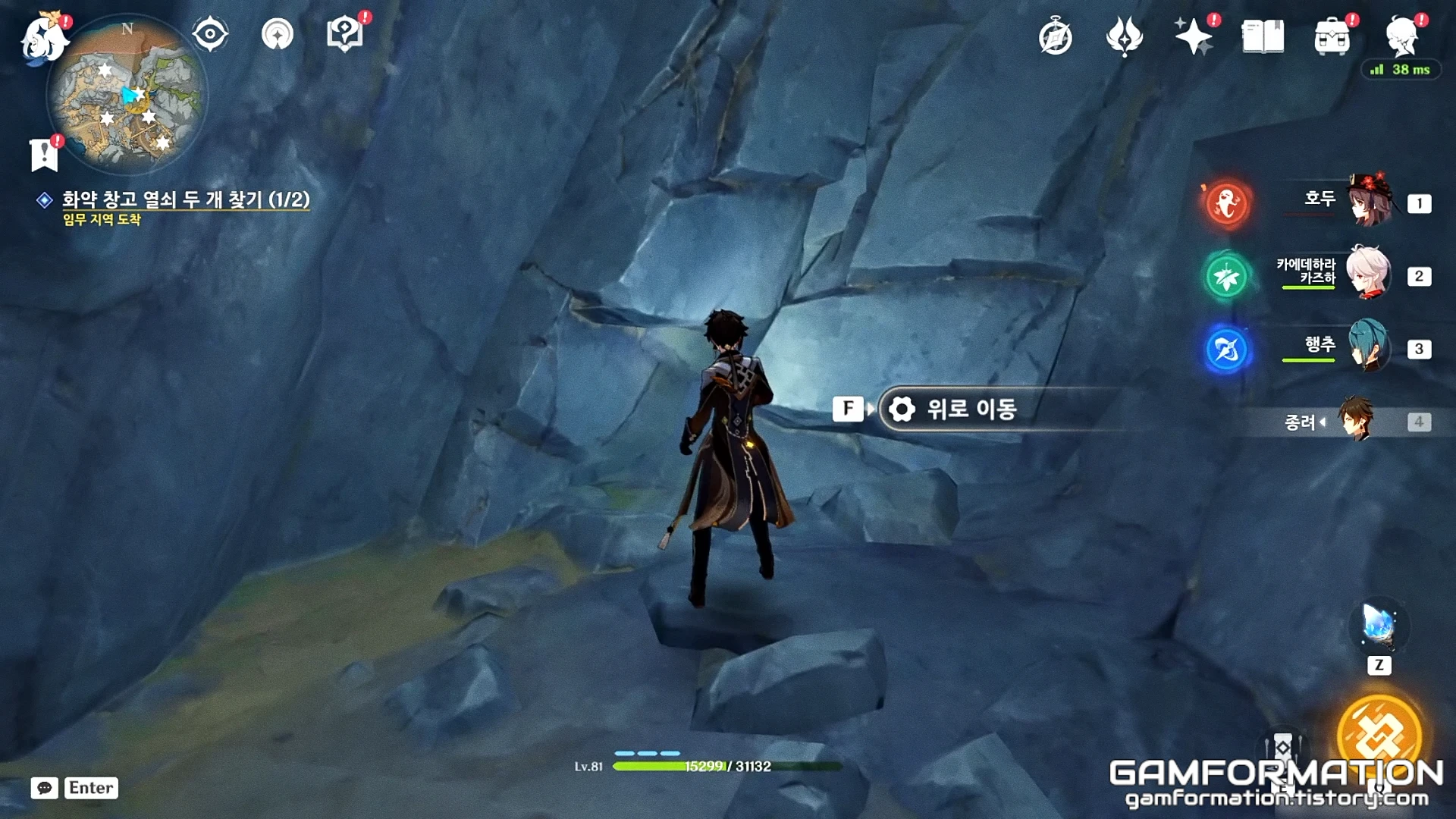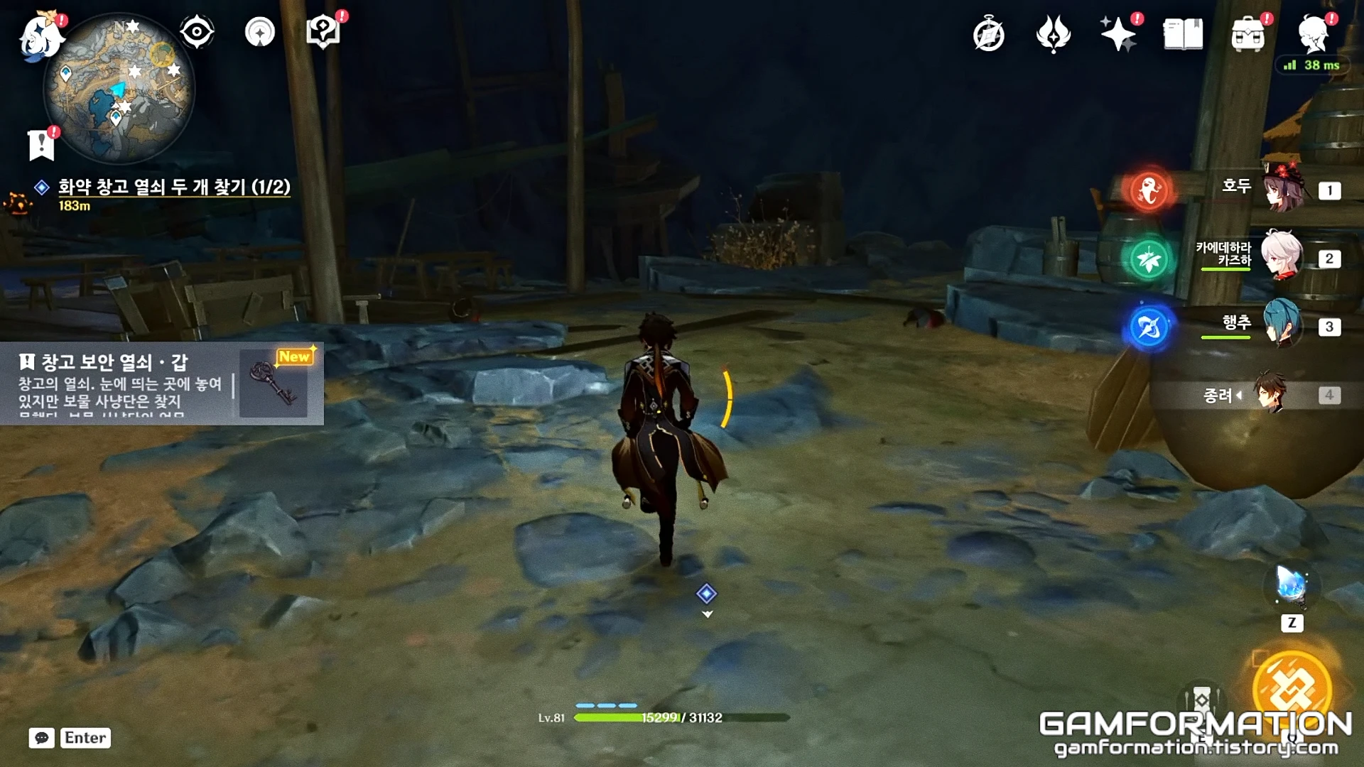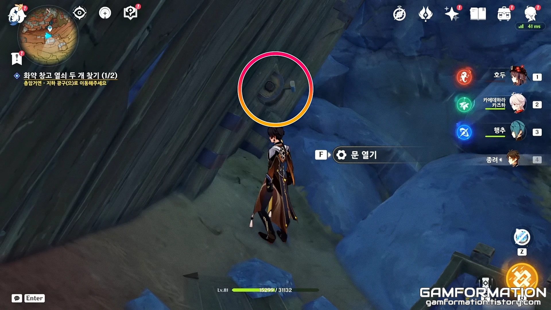 원신에서 월드 임무인 구천의 바위 조각 퀘스트를 진행하다 보면 막혀있는 통로를 뚫기 위해 개산포를 이용하기로 하게 된다. 그런데, 포는 있지만 포탄이 없어 포탄이 들어있는 창고로 들어가야만 하게 되는데, 이때 필요한 화약 창고의 두 열쇠를 찾는 방법에 대해 알아보고자 한다.