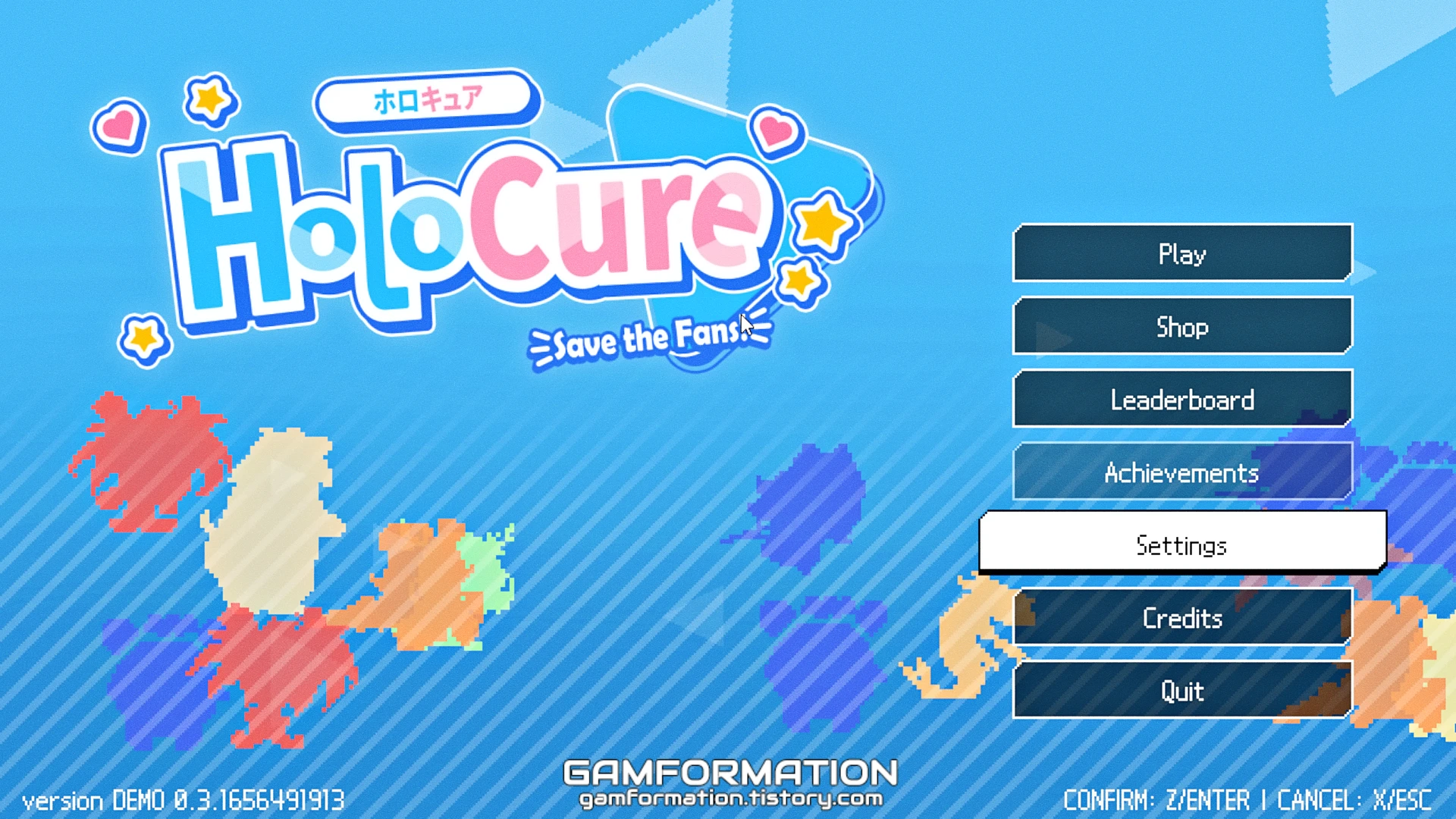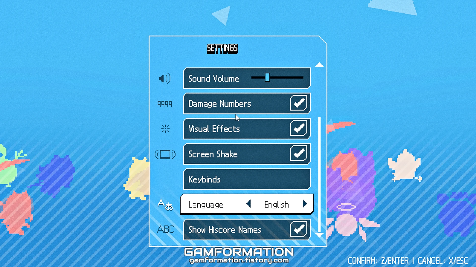 위의 방법을 통해 제대로 한글 패치된 버전을 받고 실행했다면, 기본적으로는 위의 이미지처럼 언어가 영어에 맞춰져 있게 된다. 따라서, Settings 메뉴로 이동해 보자. 메뉴 선택은 방향키(또는 W, A, S, D)로, 확인은 Z 또는 엔터를 사용하면 된다.