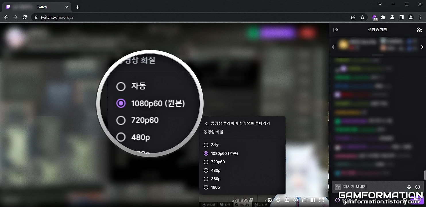 마무리로, 해당 브라우저를 통해 트위치 방송을 켜보면 1080p 60 (원본) 옵션이 사용 가능해진 것을 확인할 수 있다.