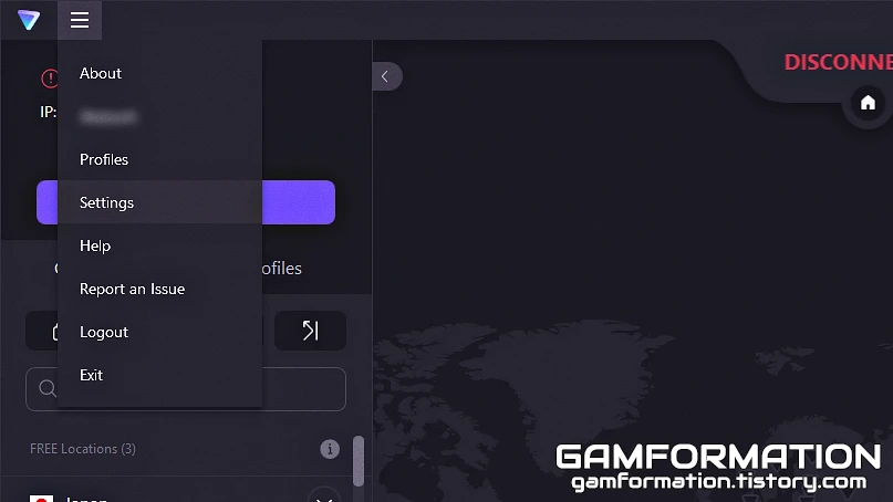 프로톤 VPN을 정상적으로 설치 후 실행까지 완료하였다면, 좌상단부 햄버거 메뉴를 통해 설정(Settings)를 눌러 설정 화면을 띄워보도록 하자.