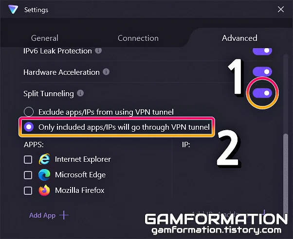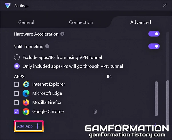 가장 아래쪽의 분할 터널링(Split Tunneling) 기능을 활성화한 뒤, VPN 터널을 사용하는 앱/IP 설정(Only included apps/IPs will go through VPN tunnel)에 체크한 후,