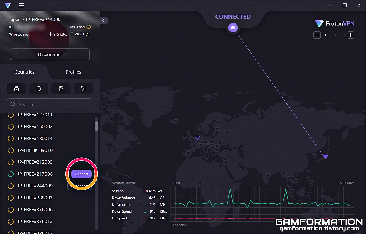 이 글을 작성할 때까지는 확인하지 못하였으나, 프로톤 VPN의 내부 서버 중 미국, 네덜란드를 통해 트위치TV를 시청하는 경우에 어느 정도의 빈도로 버퍼링이 생기는 것을 발견하였다. 따라서, 필자 기준이지만 현 시점(2023.01.17)에서 버퍼링이 거의 없는 일본 서버로만의 연결을 원한다면 위 링크를 참고해보도록 하자.