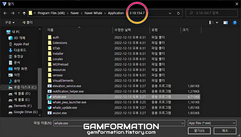 참고로, 네이버 웨일(Naver Whale)을 사용하고자 한다면, Application 폴더 → 최신 버전 폴더 → whale.exe 파일을 선택해야 제대로 작동된다. 이는 다른 컴퓨터에서 또한 마찬가지인지는 확인하지 못했다.