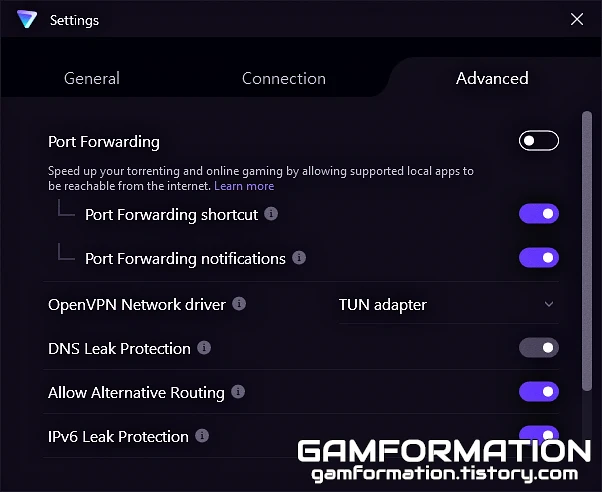 이어서, 특정 브라우저 지정을 위한 앱 분할 터널링 기능은 고급(Advanced) 탭에 존재하기에 고급(Advanced) 탭을 눌러보자.