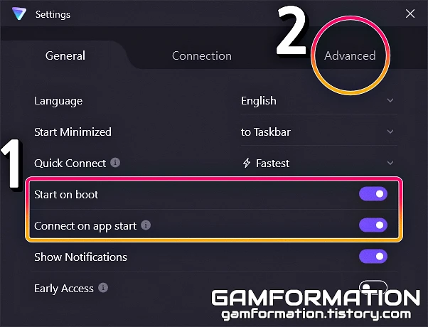 그럼 위와 같이 언어 등을 설정할 수 있는 General 탭에 맞춰진 것이 보일 텐데, 이후 시청 때마다 VPN을 켜는 게 불편할 것 같다면 부팅할 때 시작(Strart on boot)와 앱이 시작할 때 연결(Connect on app start) 옵션은 활성화 해두는 것이 좋다.