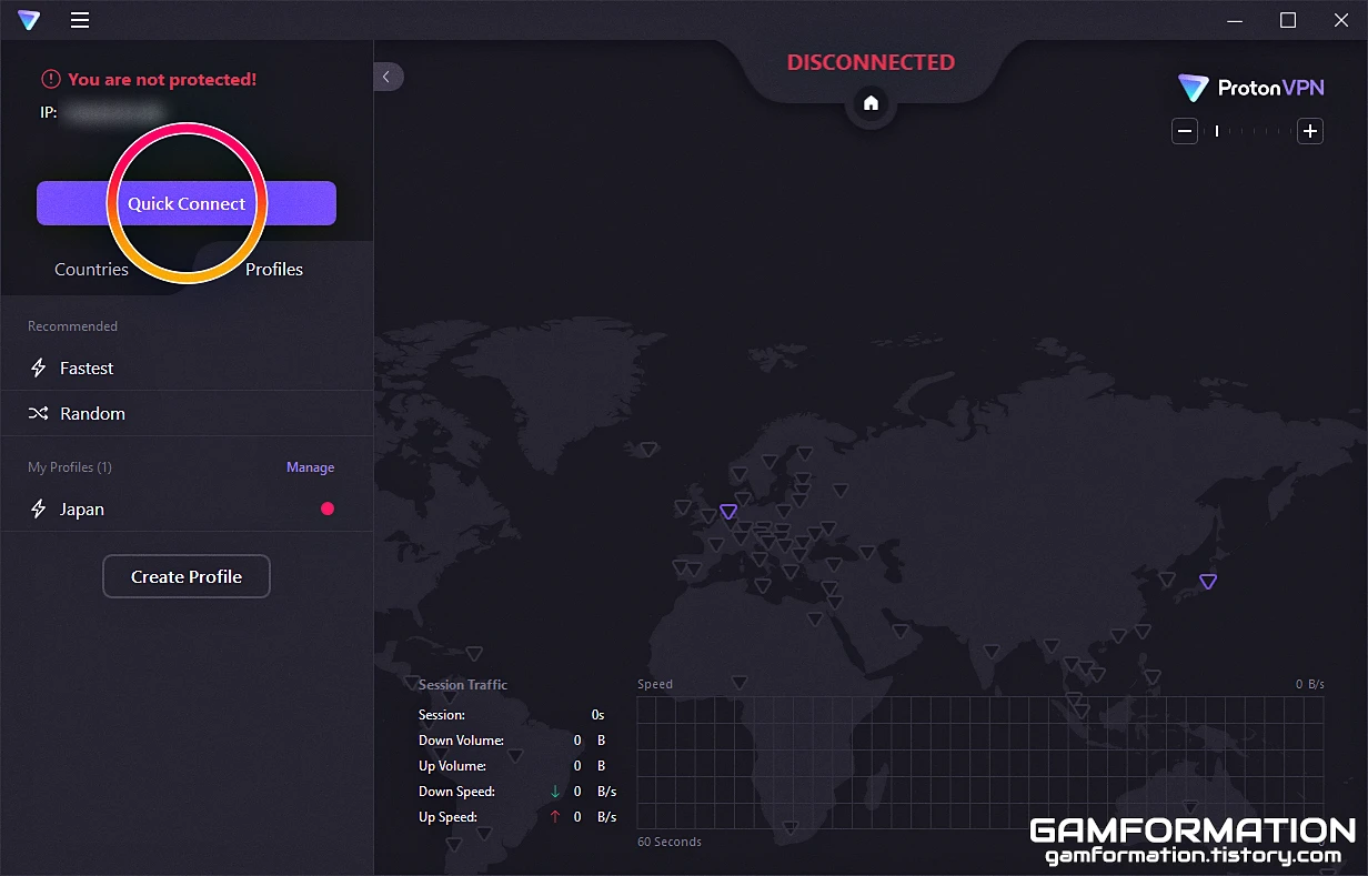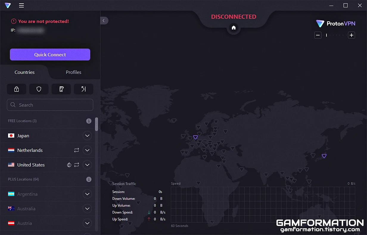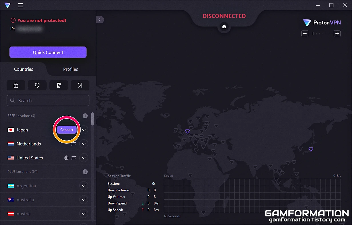 프로톤 VPN의 경우, 글이 작성되는 현시점(2023년 1월)을 기준으로 무료 사용자는 미국, 일본, 그리고 네덜란드까지 총 세 곳의 가상사설망에만 연결할 수 있다. 또한, 아무런 설정을 건드리지 않은 상태에서 연결 버튼을 눌러보면, 프로톤 VPN 자체 기준대로 지원되는 국가 중 가장 빠른 망에 연결되는데, 개인적으로 트위치TV를 시청하기에는 일본 망이 버퍼링이 없었기에 이런 식으로 특정 국가로만 연결하는 방법에 대해 알아보고자 한다.