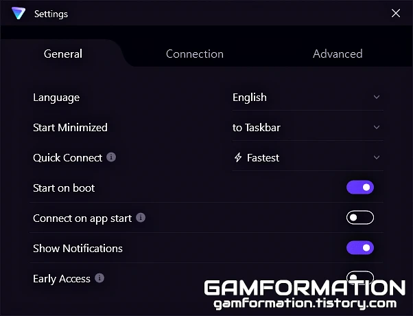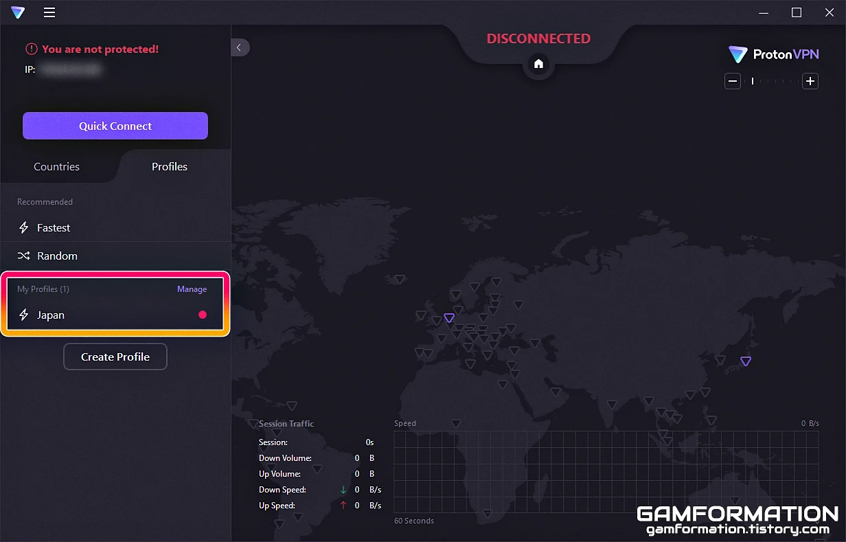 Quict Connect 항목을 기본 프로파일인 Fastest에서 방금 만든 항목으로 바꾸고 설정 창을 닫아주게 되면, 앞으로 Quict Connect(빠른 연결) 버튼을 누르거나 자동 연결 시 앞서 만든 프로파일 설정대로 정해진 국가로만 연결되는 것을 확인할 수 있게 된다.