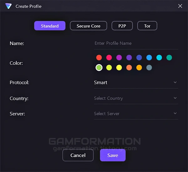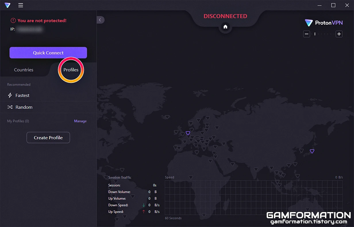 이어서 Profiles(프로파일) 탭을 눌러보면 위의 이미지와 같이 연결 방식이 Fastest(가장 빠른), Random(무작위) 두 가지만 존재하는 것을 확인할 수 있는데, 이는 제공되는 모든 위치의 가상사설망을 대상으로 하기에 Quick Connect(빠른 연결) 시 원하는 국가로만 연결되지 않는 문제가 있다.