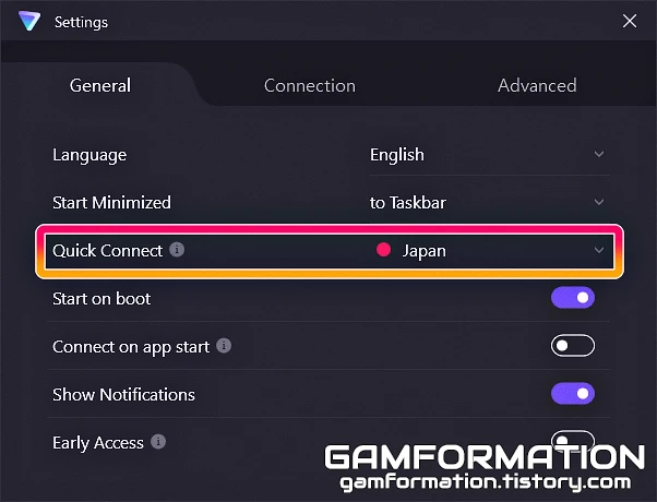 시작하기에 앞서, 원하는 서버로의 연결이 되는지부터 확인해보자. 일본 쪽으로만 연결을 원한다면, Japan 옆의 Connect 버튼을 눌러 연결되는지 확인해볼 필요가 있다. 여기서 연결되지 않는다면(2 ~ 3회 반복 포함) 아래 내용대로 설정하더라도 연결되지 않으며, 정상적으로 연결된다면 앞선 이미지처럼 좌상단부에 해당 국가의 국기가 표시되며 연결되게 된다.