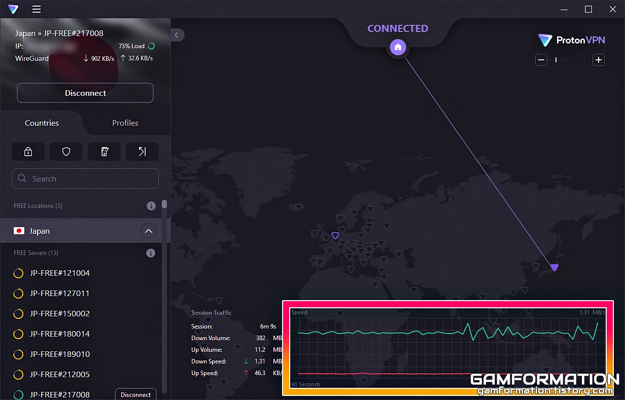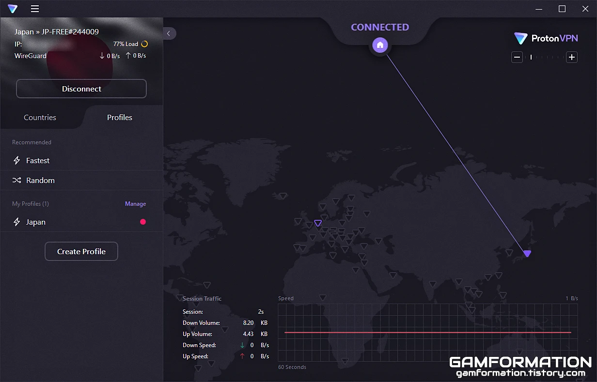 위처럼 바로 지정한 국가(필자의 경우 Japan) 내의 가장 빠른 서버로 연결되게 된다. 이는 방금 언급했듯 자동 연결 시에도 마찬가지로 작동하므로, 프로톤 VPN의 설정에서 자동 연결 기능을 켜둔 상태라면 매번 불편하게 국가를 수동으로 바꿀 필요가 없어지게 된다.