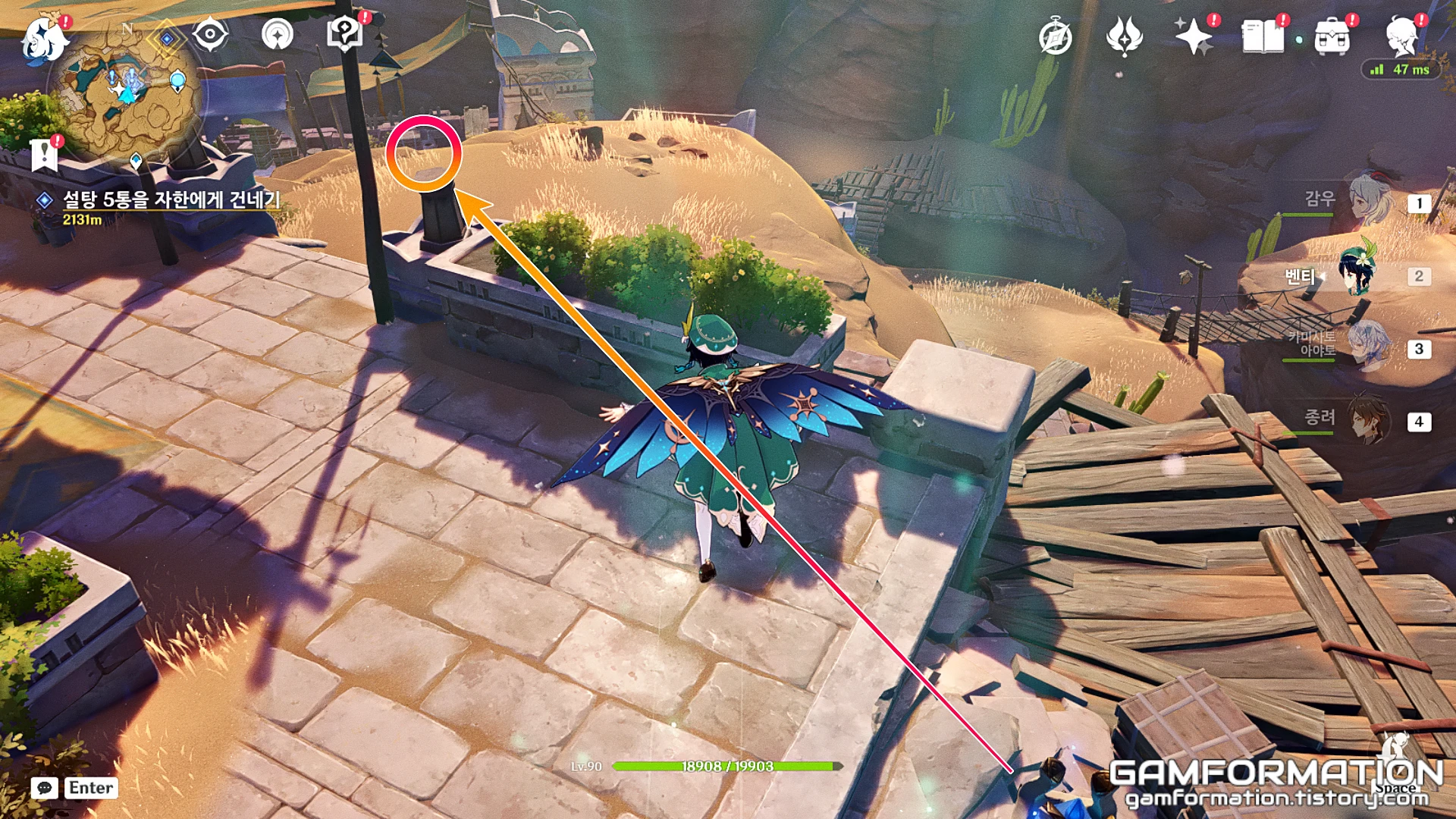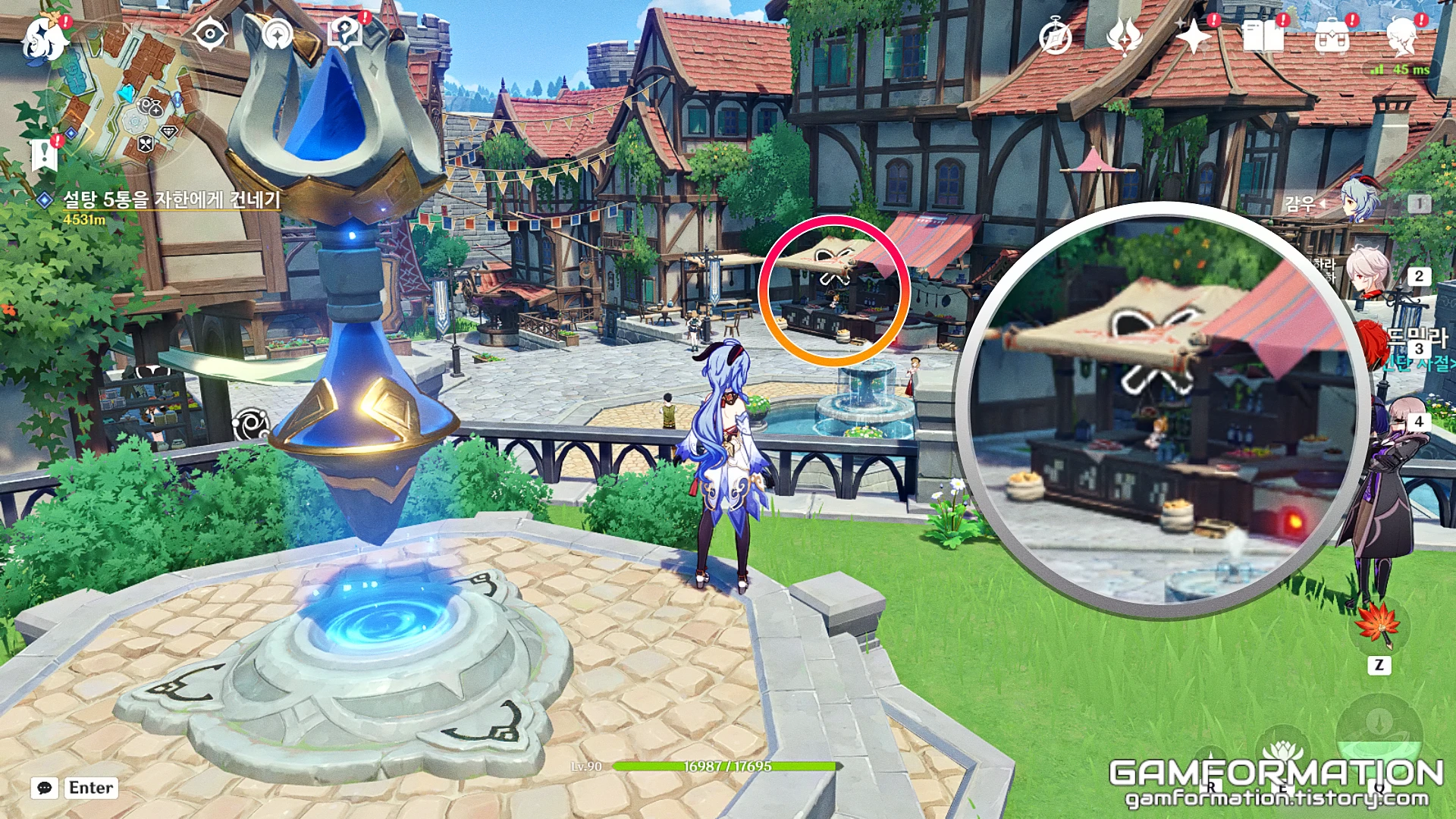 이후, 워프 포인트에서 북쪽 방향을 보면, 위 이미지에 동그라미 친 위치에 상인인 아잘라이가 있는 것을 확인할 수 있고, 아잘라이를 통해 구매해주면 3.5 버전 업데이트 기준으로 구매할 수 있는 모든 NPC를 통해 설탕을 구매했다고 생각해 주면 된다. 참고로 이미지는 워프 포인트와 아잘라이의 위치를 함께 표현하고 싶었으나, 부득이하게도 아잘라이가 보이지 않는 점은 양해를 구한다.