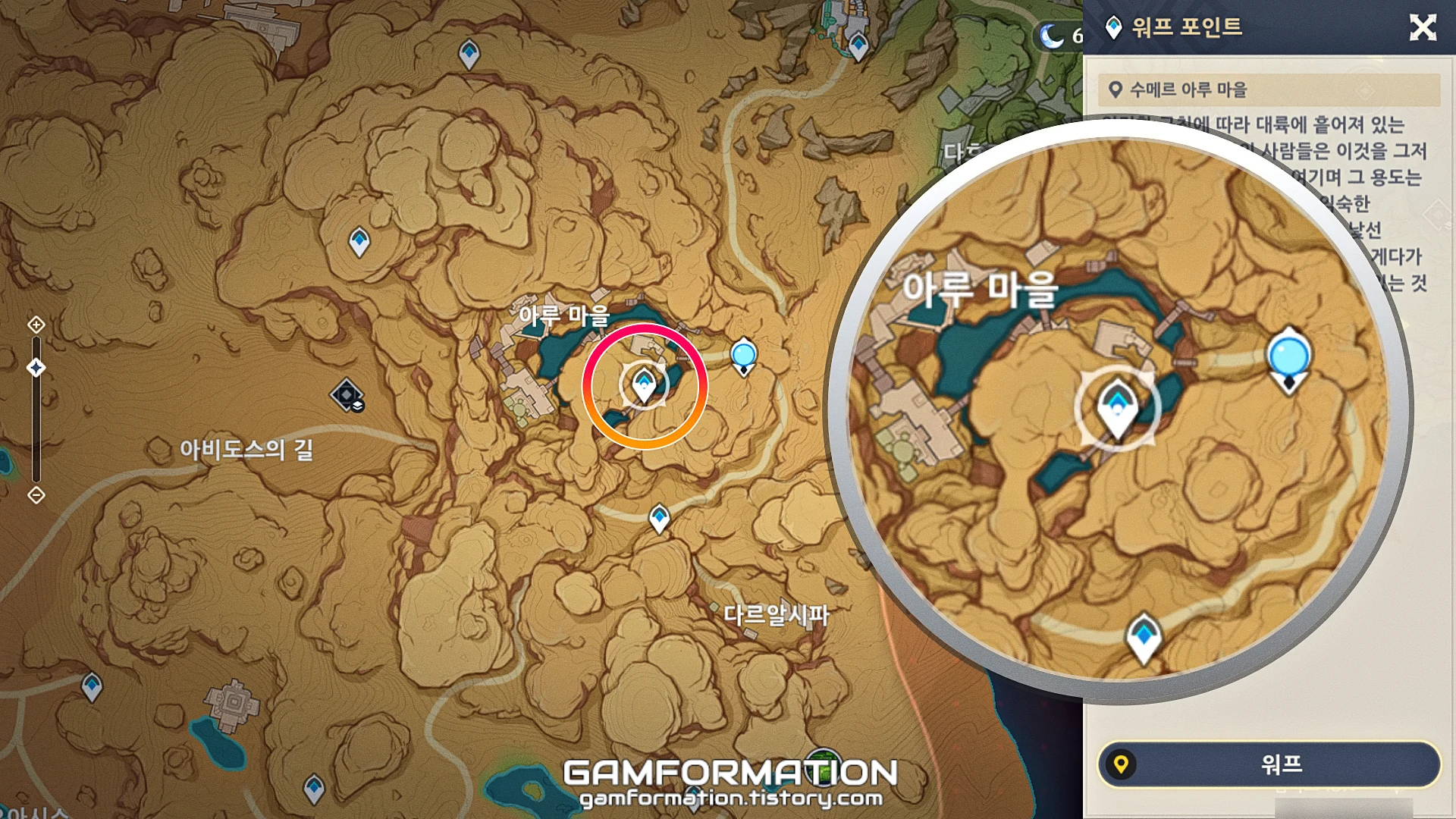 수메르성의 좌측 방향에 위치한 아루 마을이다. 바로 이동해 보자.