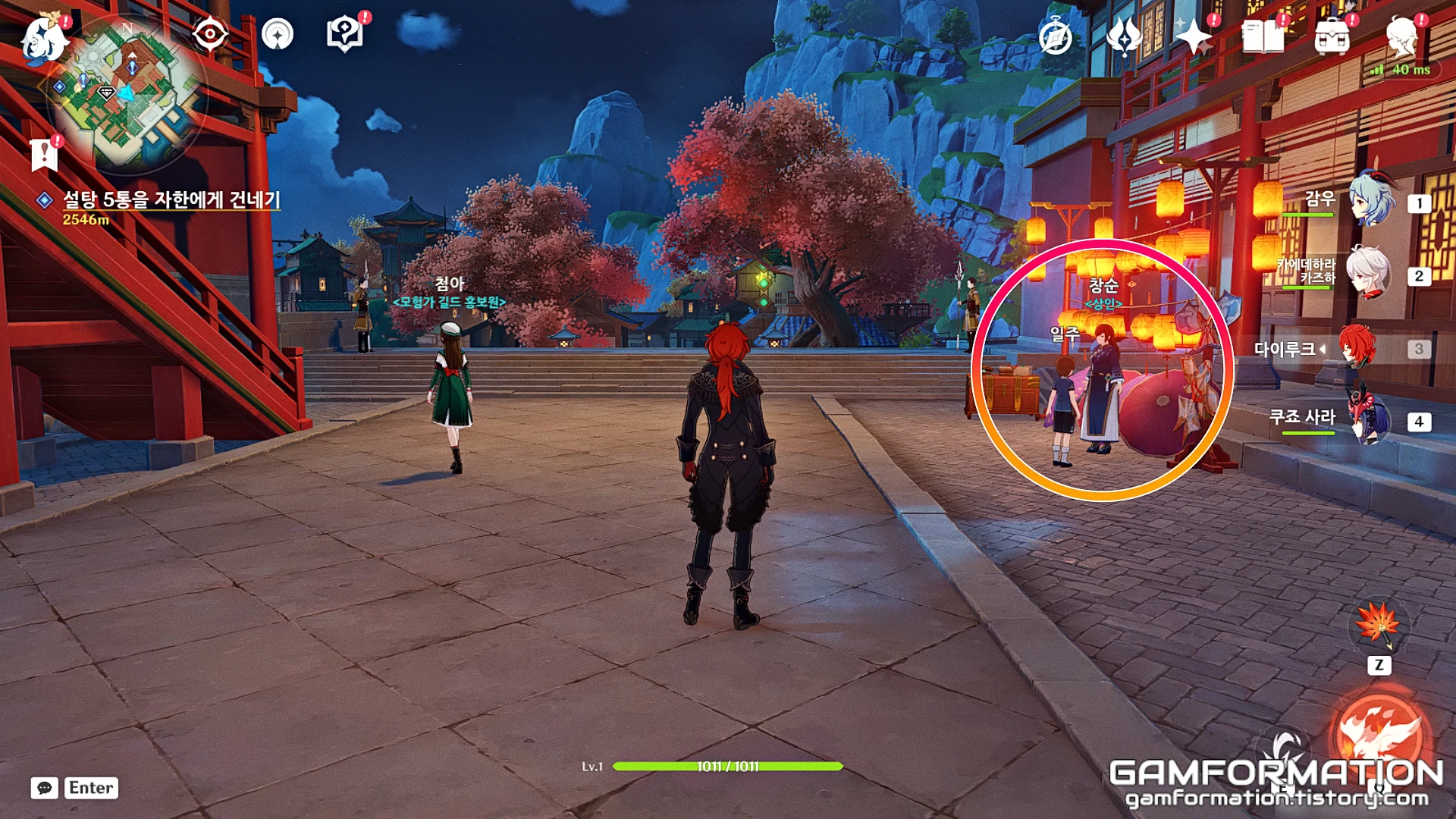 창순의 경우, 특정 상점 내부에 위치하지 않기에 약간은 헤맬 수도 있는데, 위 지도에서 가리키는 곳까지 이동했다면 위와 같은 곳에 NPC 창순이 서있는 것을 확인할 수 있다.
