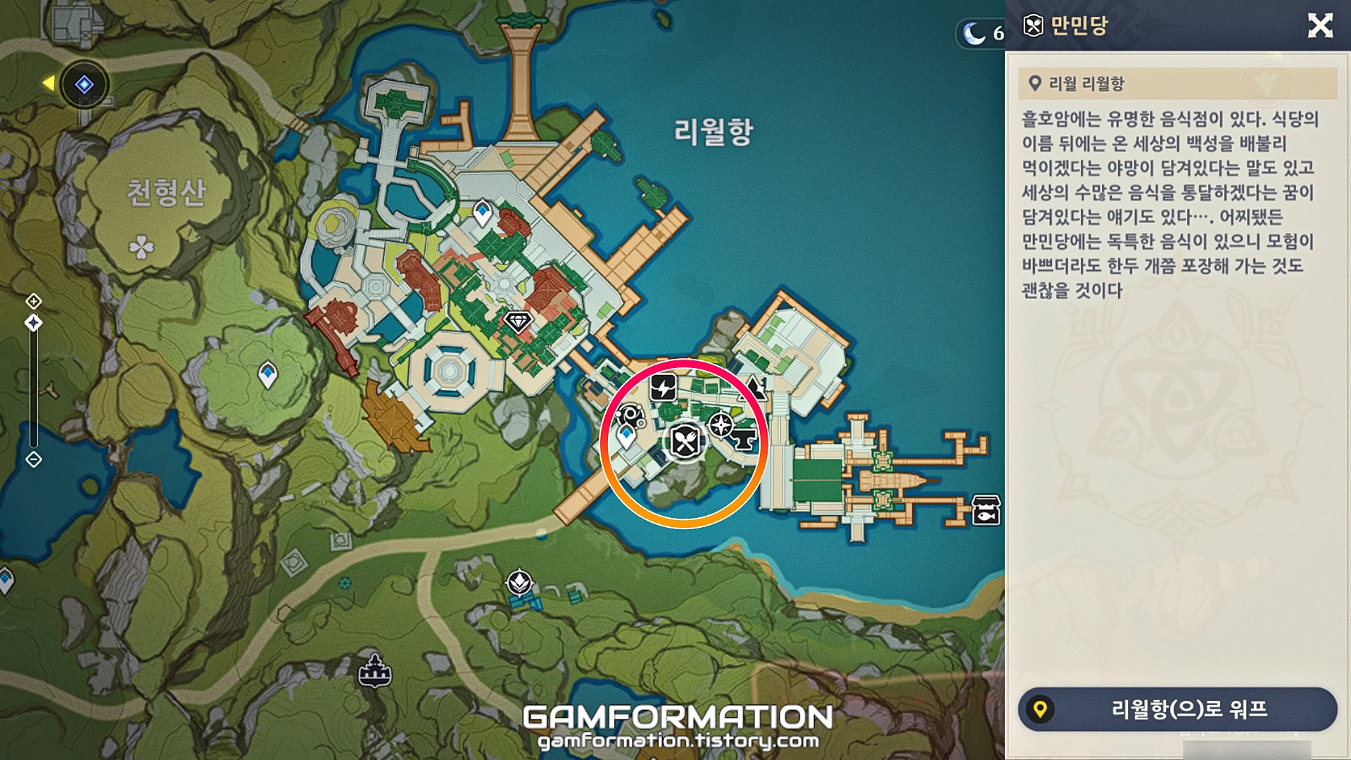 정 찾질 못하겠다면, 리월의 평판 레벨을 5 이상 달성했을 때 얻을 수 있는 선인 찾는 미식가라는 화덕 아이템을 사용하는 방법도 있다. 하지만, 요리를 할 때마다 아이템(화덕)이 소모되기에, 차라리 필자처럼 몬드성의 디어 헌터 레스토랑으로 이동하는 게 나을 수 있다.