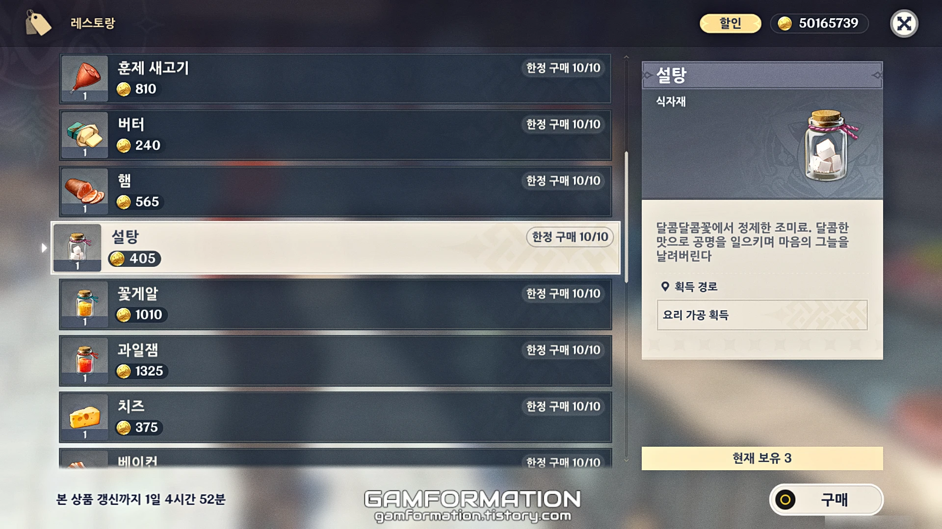 리월부터는 바로 앞선 몬드 설명에서 아이템의 구매 가능 개수, 할인 조건, 그리고 상점의 리셋 주기까지 설명했으므로, 단순히 설탕을 구매할 수 있는 NPC의 위치에 대해서만 알아볼까 한다.