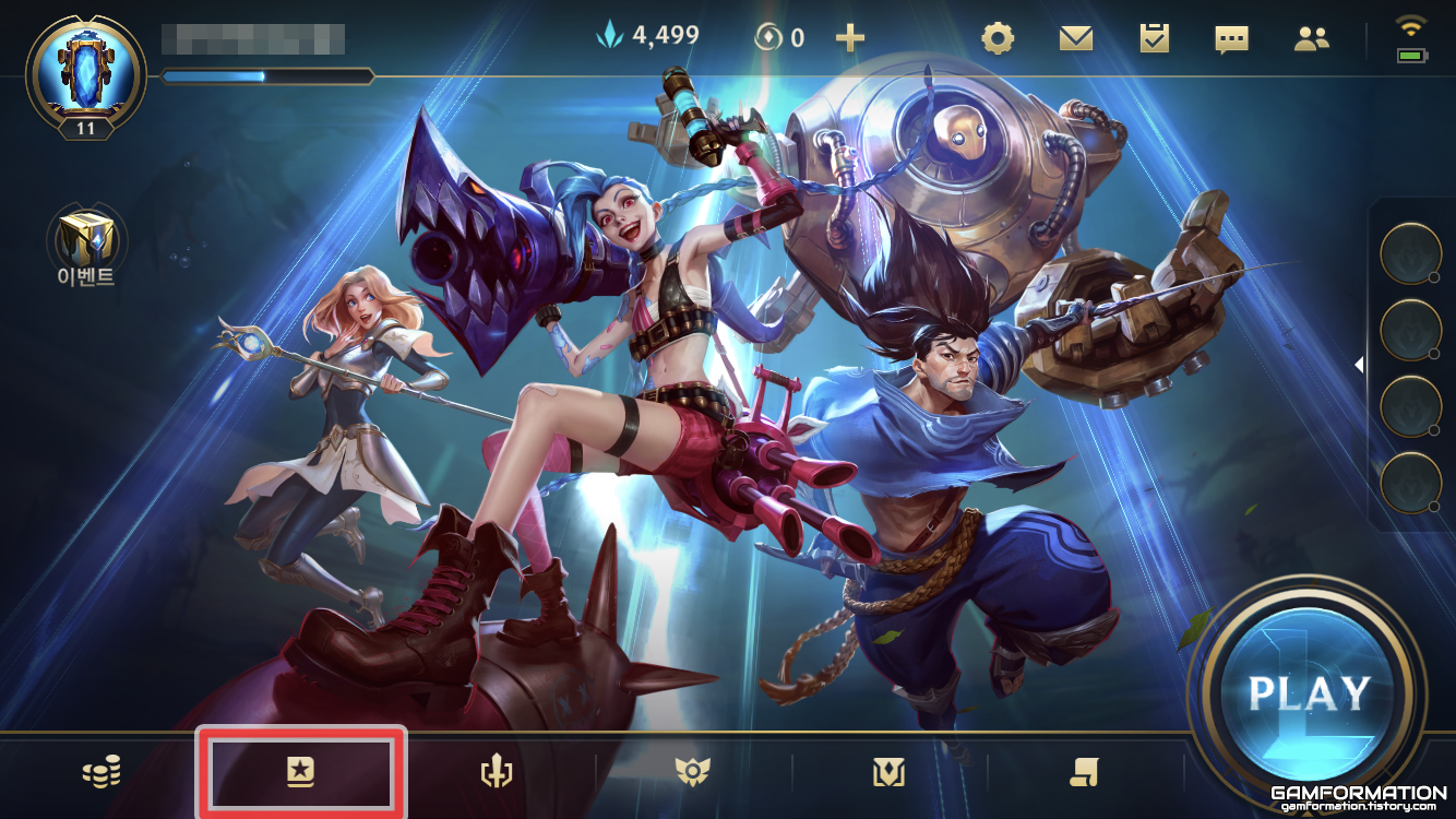 조건이 게임 3회에서 감정표현 사용이므로 PVP건 AI건 챔피언 선택 후 게임 내로 들어와야만 조건을 충족할 수 있다. 게임 내에서 오른쪽 위를 보면 메뉴 버튼과 대화창이 있는데, 대화창을 선택하여 감정표현을 사용해주면 된다.