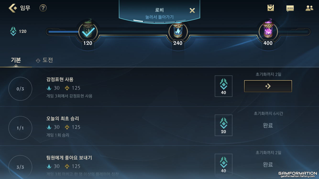 게임을 마치고 나와보면 임무 탭에서 감정표현 사용 횟수가 늘어난 것을 볼 수 있다. 이제 남은 보상들까지 전부 얻을 수 있도록 노력해보자.
