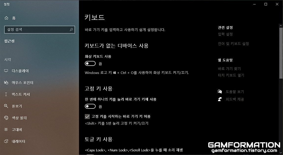 눌렀을 때 이 창이 떠야 한다. 만약 이 창이 뜨지 않거나, Shift 키를 5회 이상 반복해서 눌렀음에도 고정키 창이 뜨지 않는다면 아래와 같은 경로를 통해 마찬가지의 창을 불러올 수 있다.