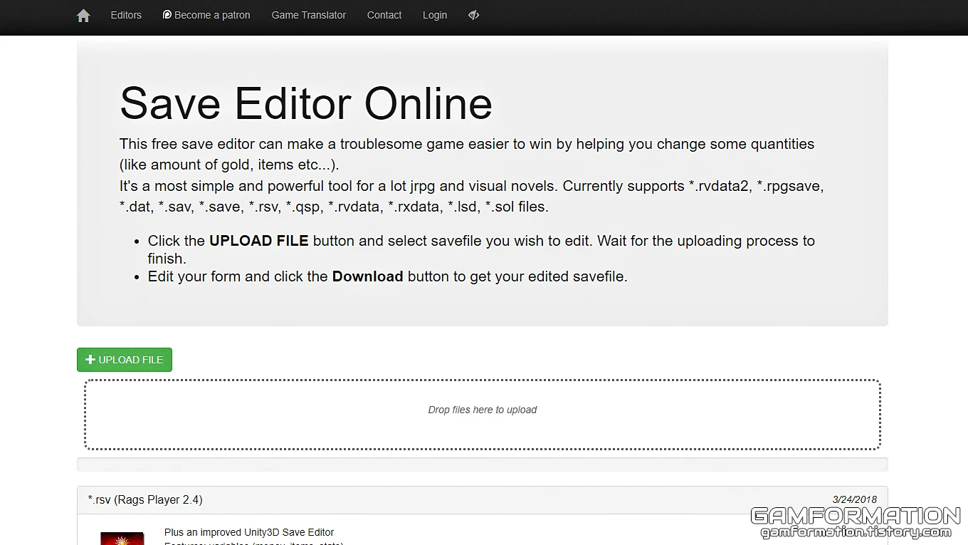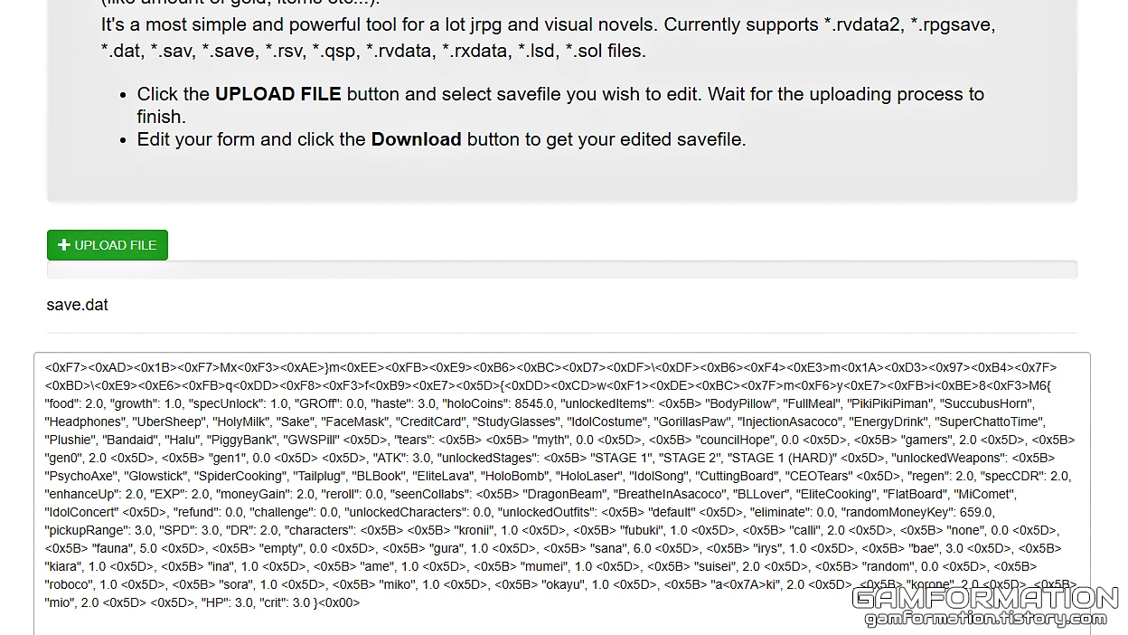 그럼, 업로드 파일을 직접 선택할 수도 있지만 Drop files here to upload라는 문구를 보면 알 수 있듯, 해당 위치로 파일을 드래그&드롭하는것으로도 업로드가 가능하다. 따라서, 위 이미지를 참고하여 save.dat 파일을 Drop files here to upload라고 적힌 부분으로 끌어 넣어보자.