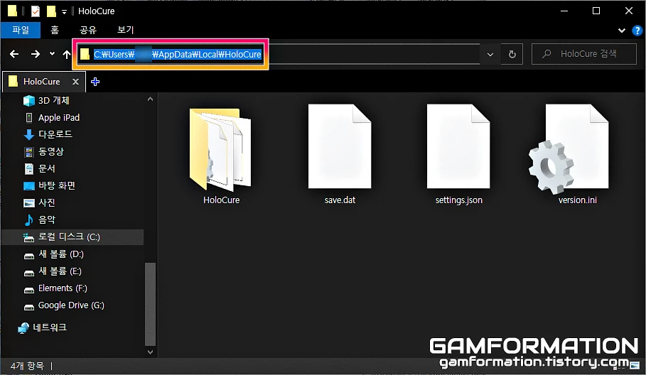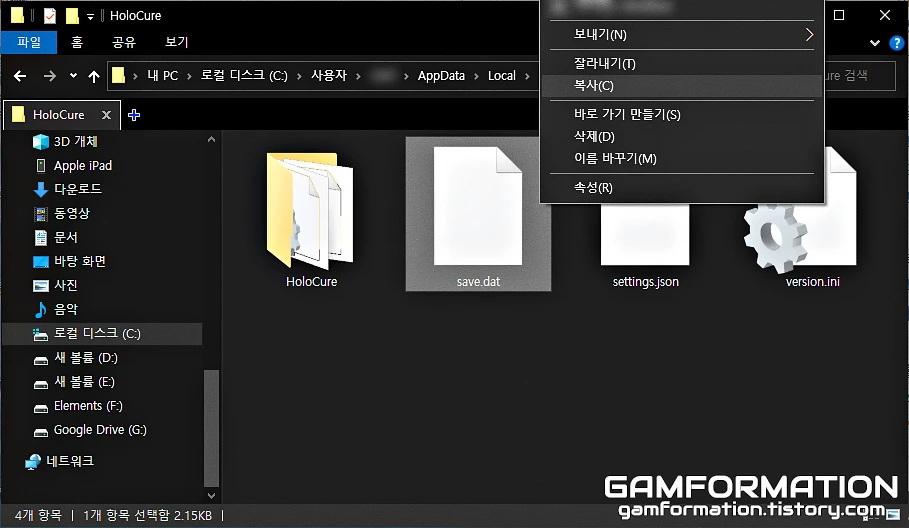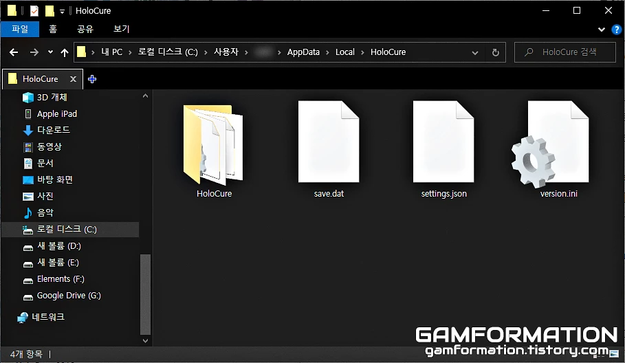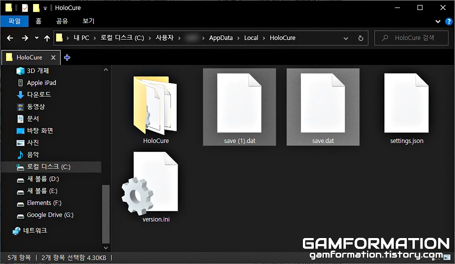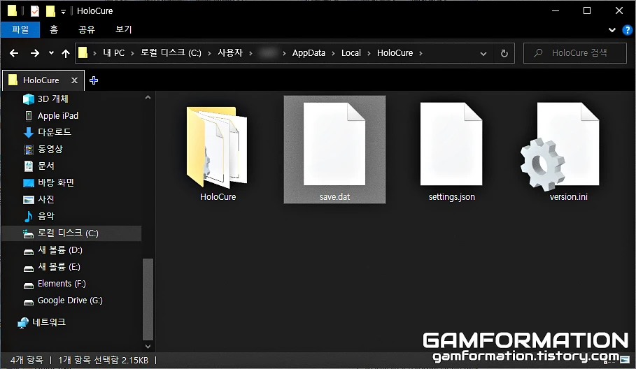우선, 돈(홀로코인) 수치 변경을 위해서는 현재 플레이 중인 컴퓨터에 저장된 홀로큐어의 세이브 파일이 필요하다. 세이브 경로로 단숨에 갈 수 있는 방법은 위 글을 통해 이전에 이미 작성해뒀기에, 위 링크를 통해 세이브 파일이 저장된 경로까지 들어가 보도록 하자.