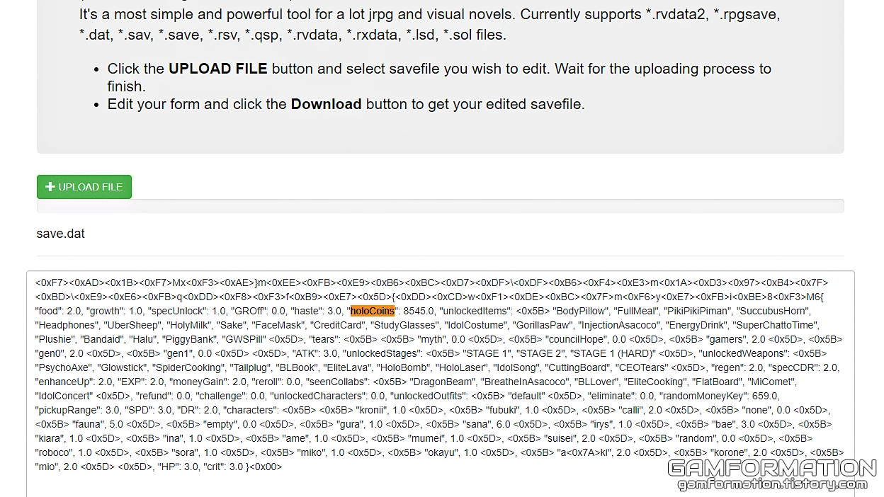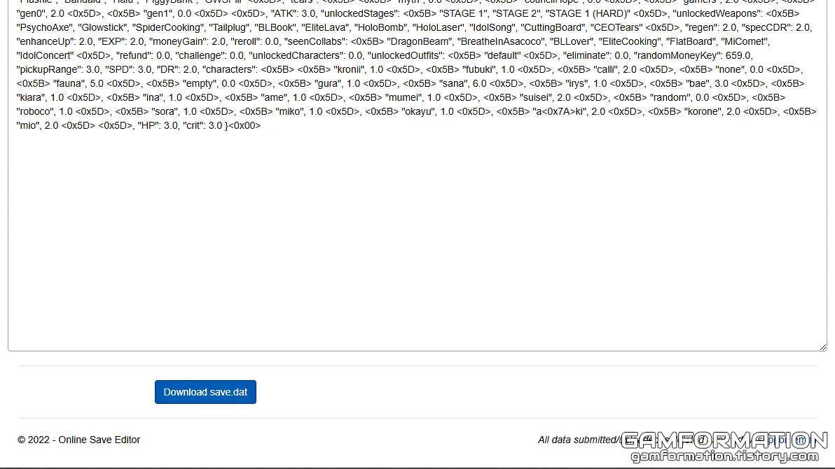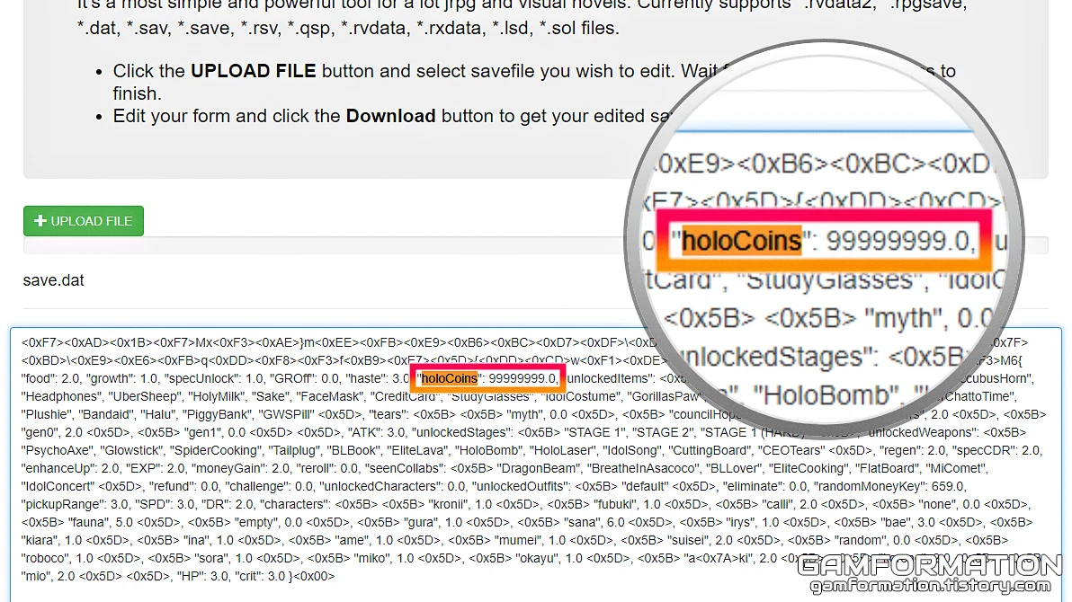 그렇게 holoCoins 부분의 값을 변경했다면, 아래의 파란 버튼(Download save.dat)을 눌러 세이브 파일을 받아주자.